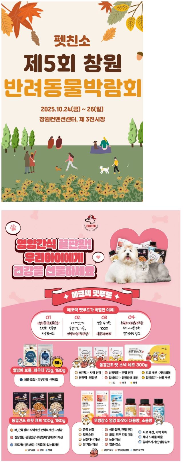 Hello, this is Ecotech. We will meet you with Ecotech's low-temperature roasted dual kibble formula feed at Changwon Convention Center Exhibition Hall 2 from October 24 (Fri) to 26 (Sun), 2025. We appreciate your interest and support.